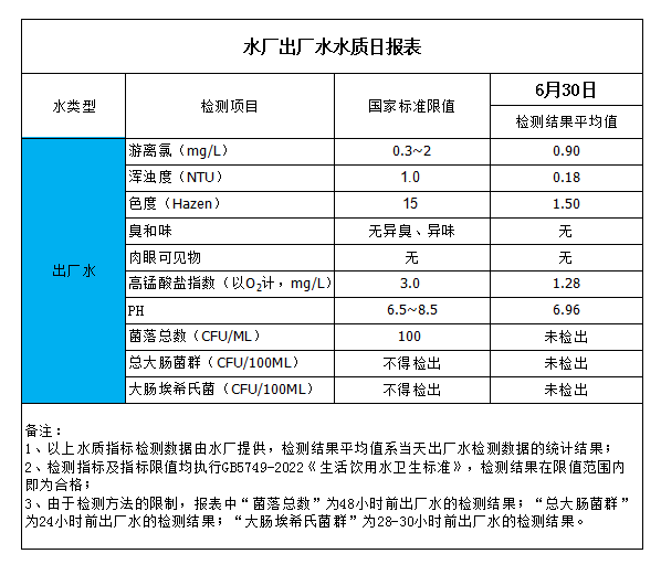 水廠出廠水水質日報表(2023-6-30)