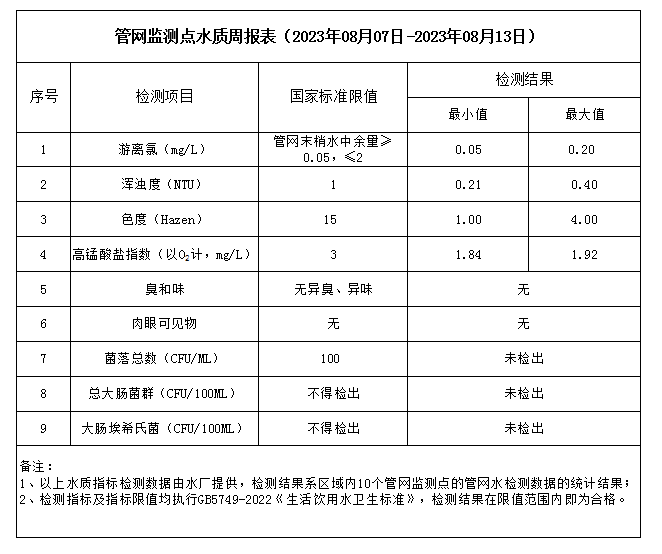 管網(wǎng)監(jiān)測(cè)點(diǎn)水質(zhì)周報(bào)表(2023年08月07日-2023年08月13日)