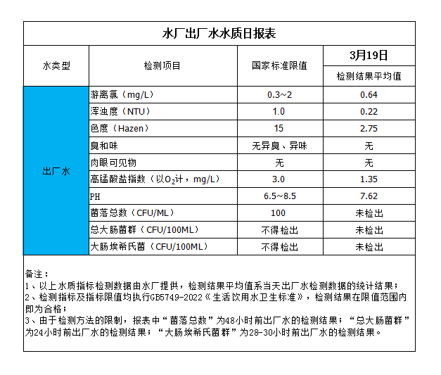 水廠出廠水水質(zhì)日?qǐng)?bào)表(2024-3-19)