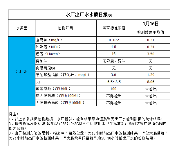 水廠出廠水水質日報表(2025-1-16)