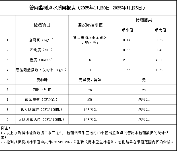 管網監測點水質周報表(2025年1月20日-2025年1月26日)